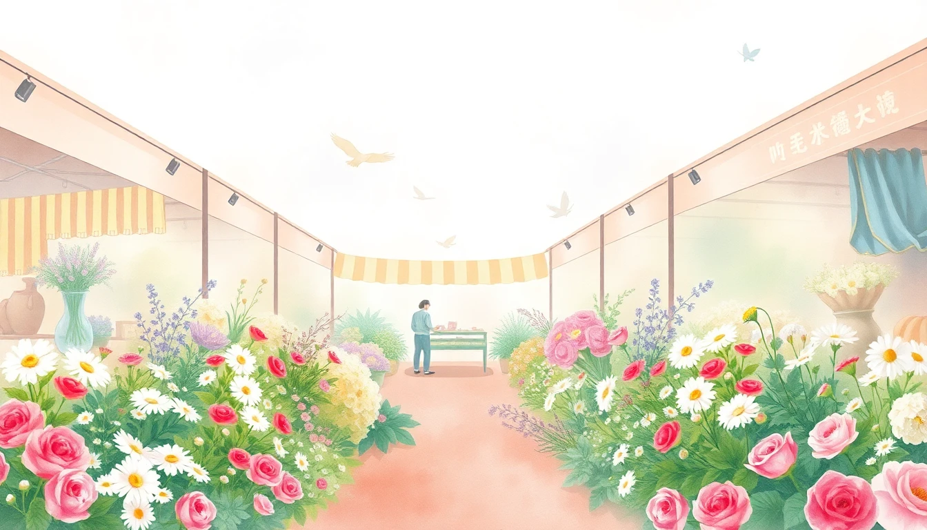 Watercolor illustration of a flower market in Dubai, AE featuring wildflowers, daisies, roses
