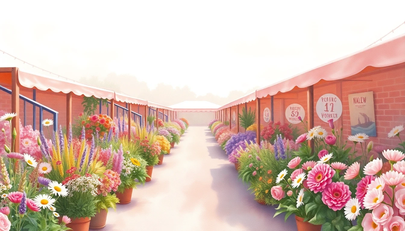 Watercolor illustration of a flower market in AL, AL featuring wildflowers, daisies, roses