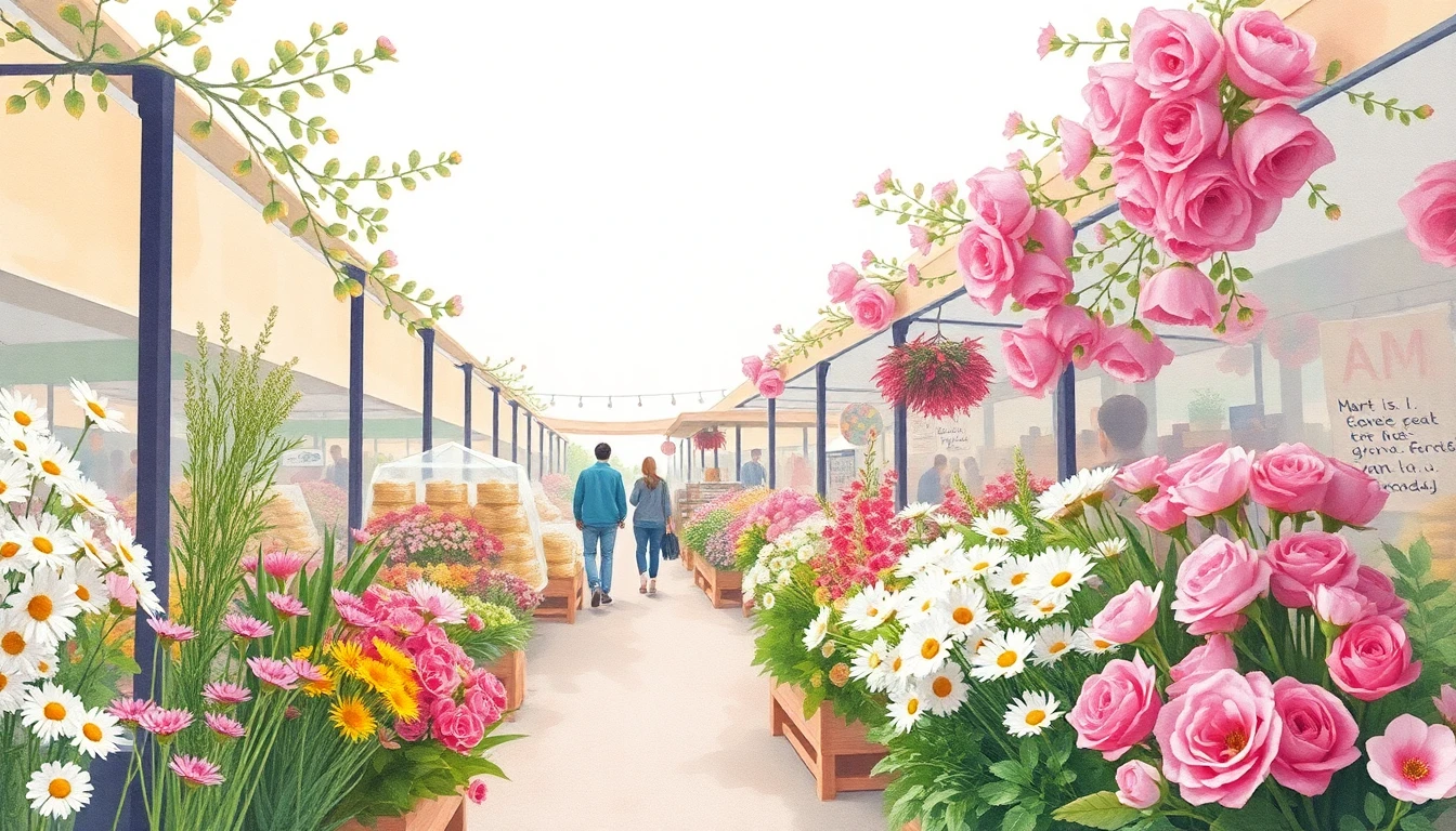 Watercolor illustration of a flower market in AM, AM featuring wildflowers, daisies, roses