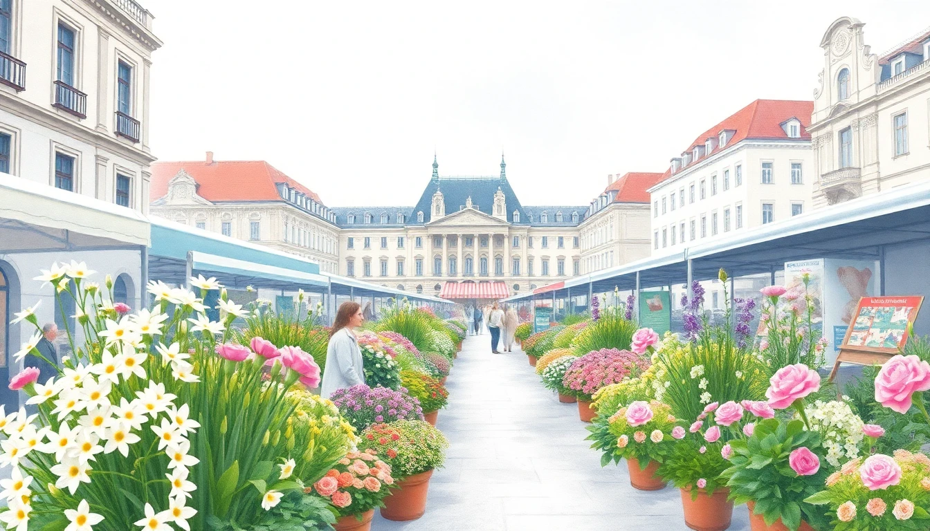 Watercolor illustration of a flower market in Wien, Austria featuring edelweiss, gentian, alpine roses