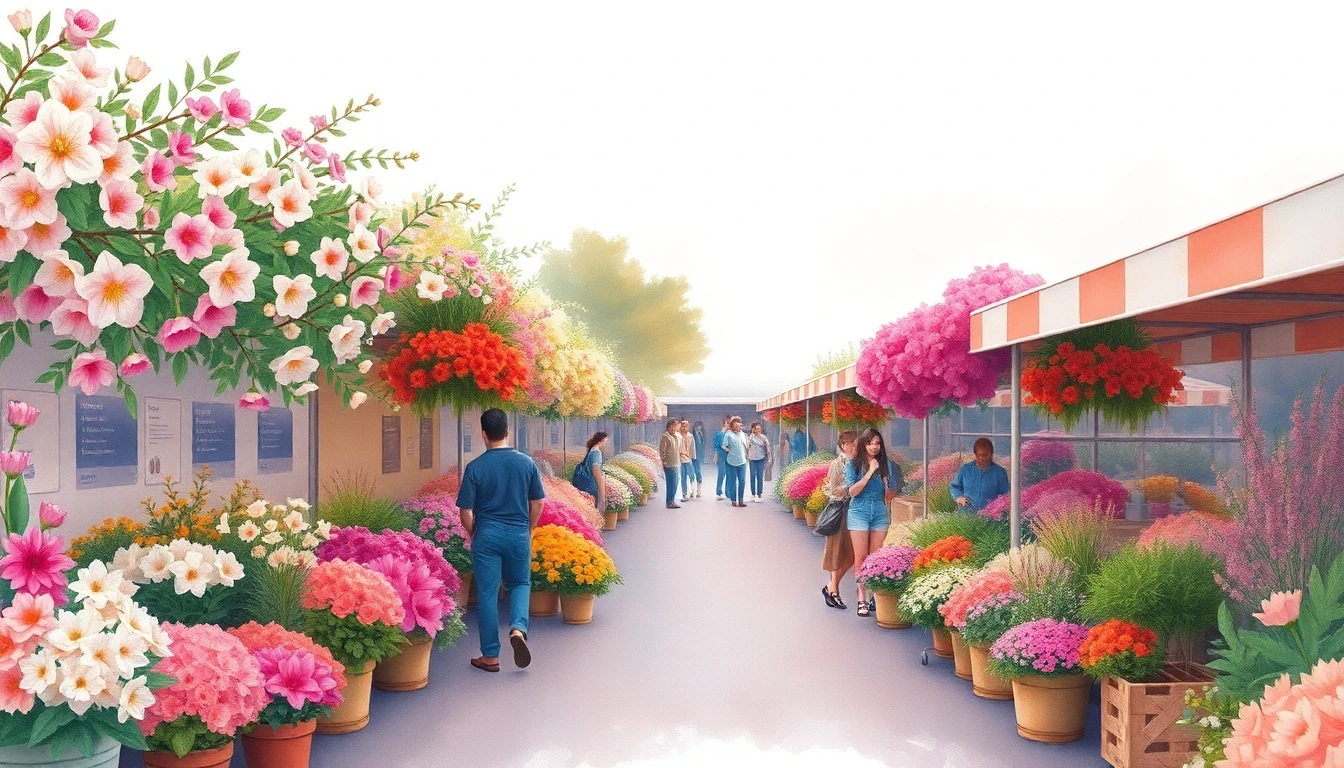 Watercolor illustration of a flower market in Sydney, Australia featuring wattle, waratah, kangaroo paw