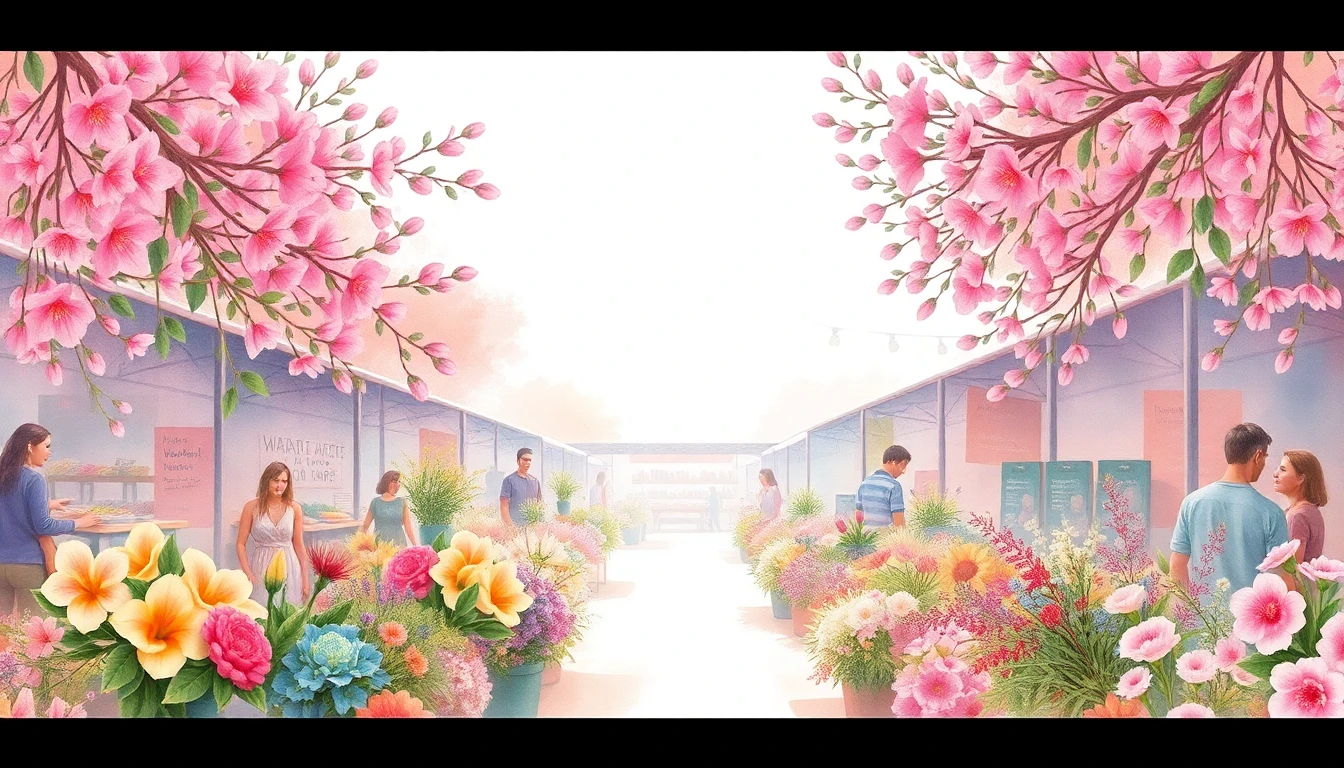 Watercolor illustration of a flower market in Melbourne, Australia featuring wattle, waratah, kangaroo paw