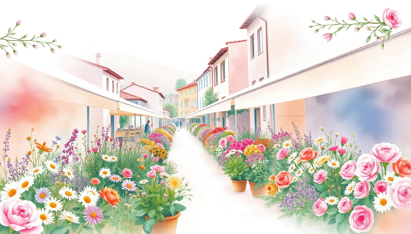 Watercolor illustration of a flower market in Mostar, BA featuring wildflowers, daisies, roses