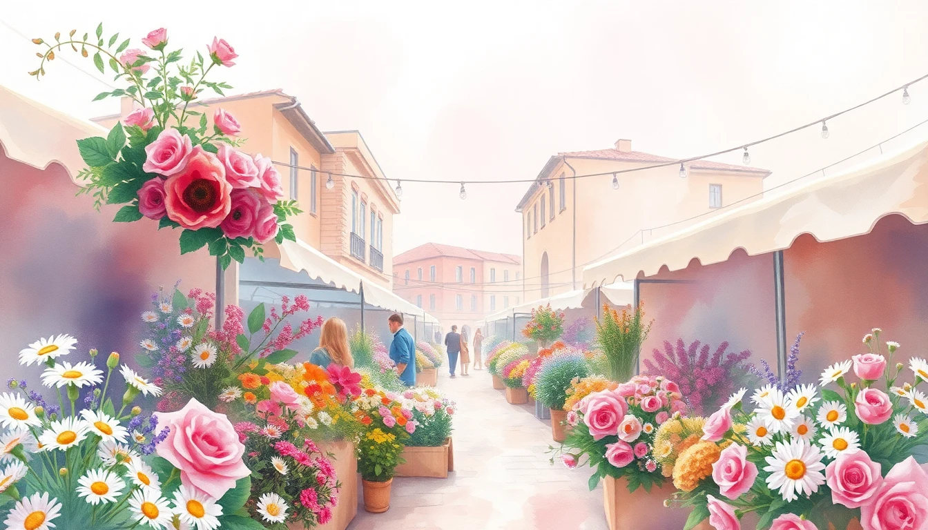 Watercolor illustration of a flower market in Sarajevo, BA featuring wildflowers, daisies, roses
