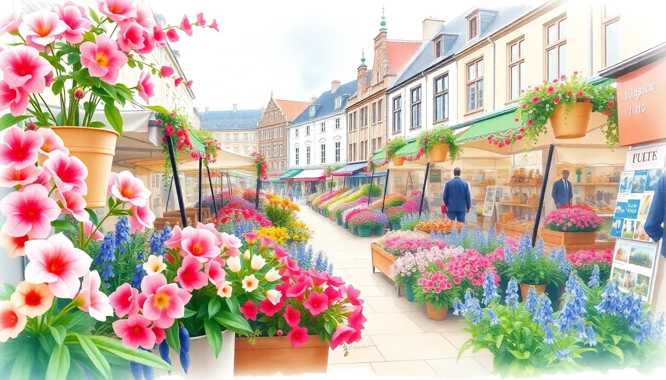 Watercolor illustration of a flower market in Brussels, Belgium featuring azaleas, begonias, bluebells