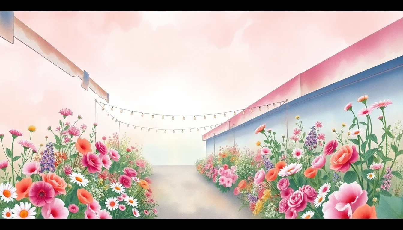 Watercolor illustration of a flower market in Cochabamba, BO featuring wildflowers, daisies, roses