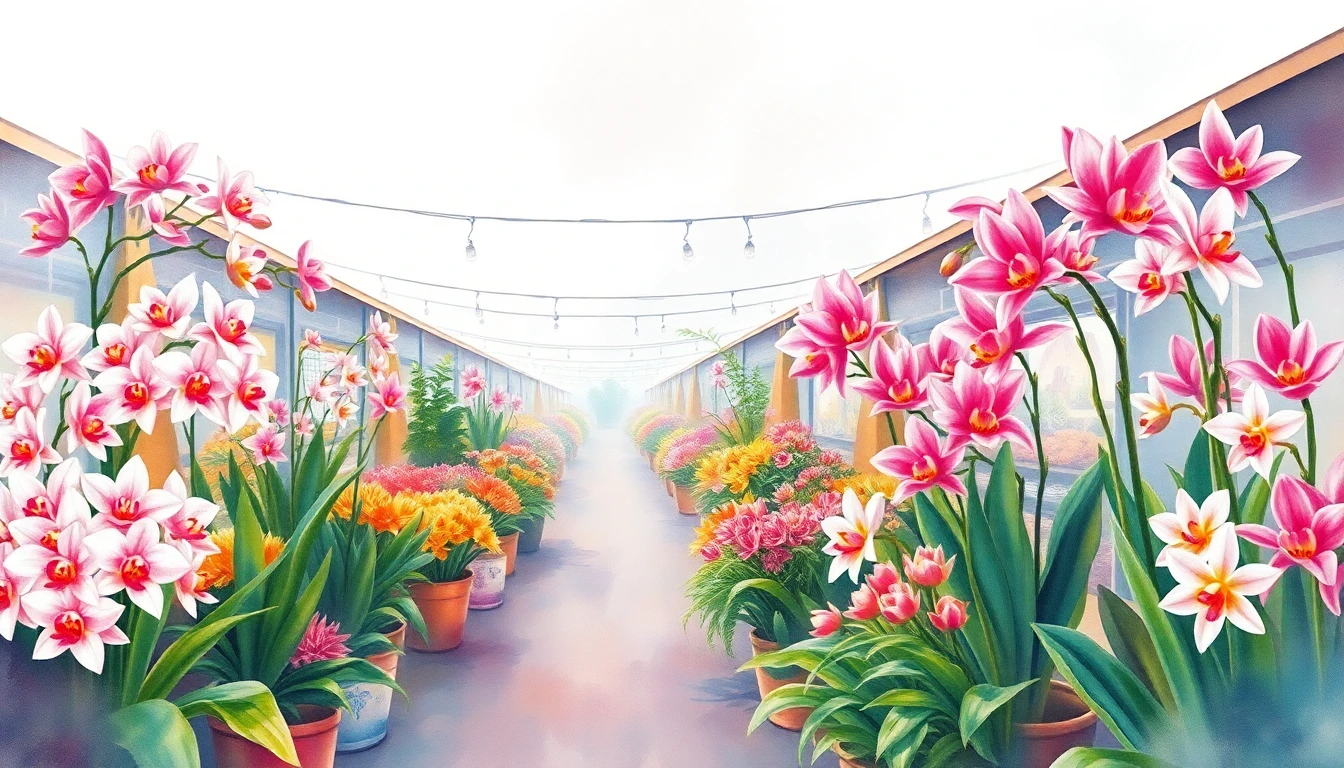 Watercolor illustration of a flower market in Curitiba, Brazil featuring orchids, birds of paradise, ipê flowers