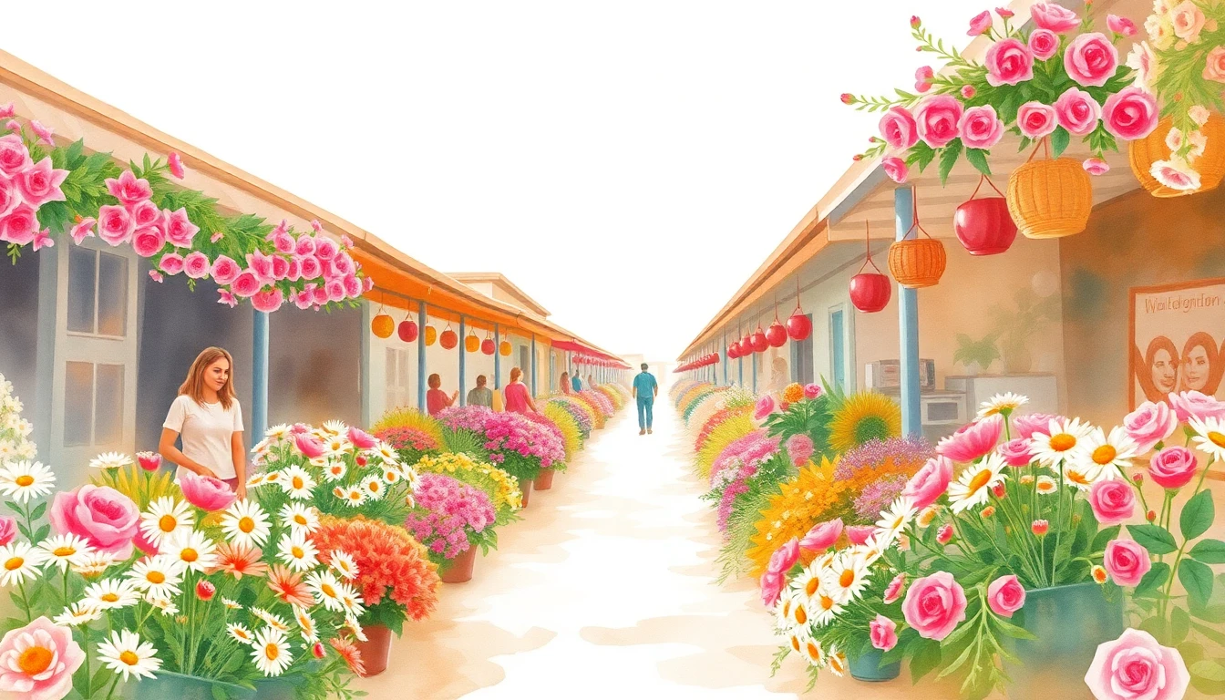 Watercolor illustration of a flower market in Orange Walk Town, BZ featuring wildflowers, daisies, roses