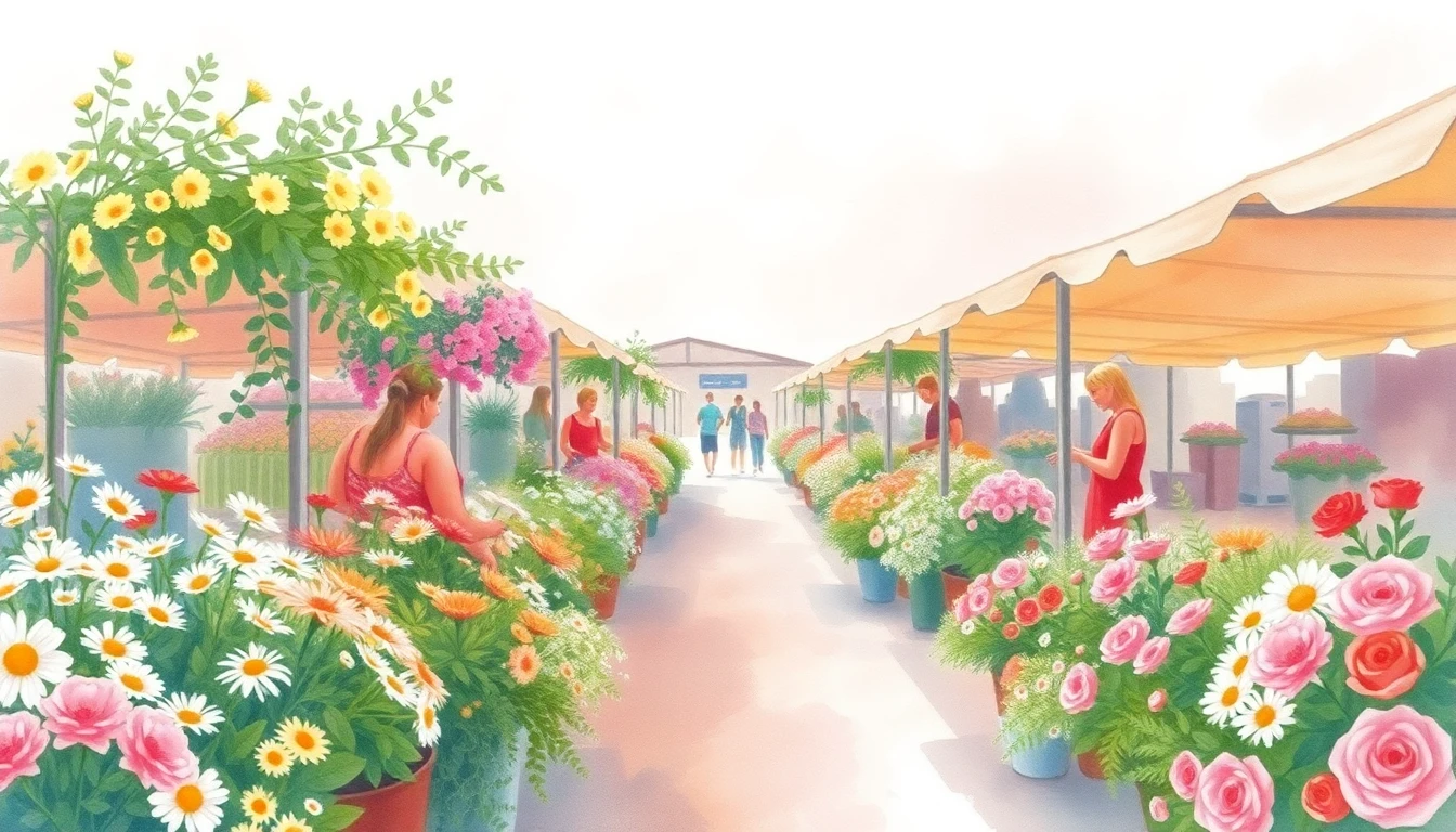 Watercolor illustration of a flower market in San Pedro, BZ featuring wildflowers, daisies, roses