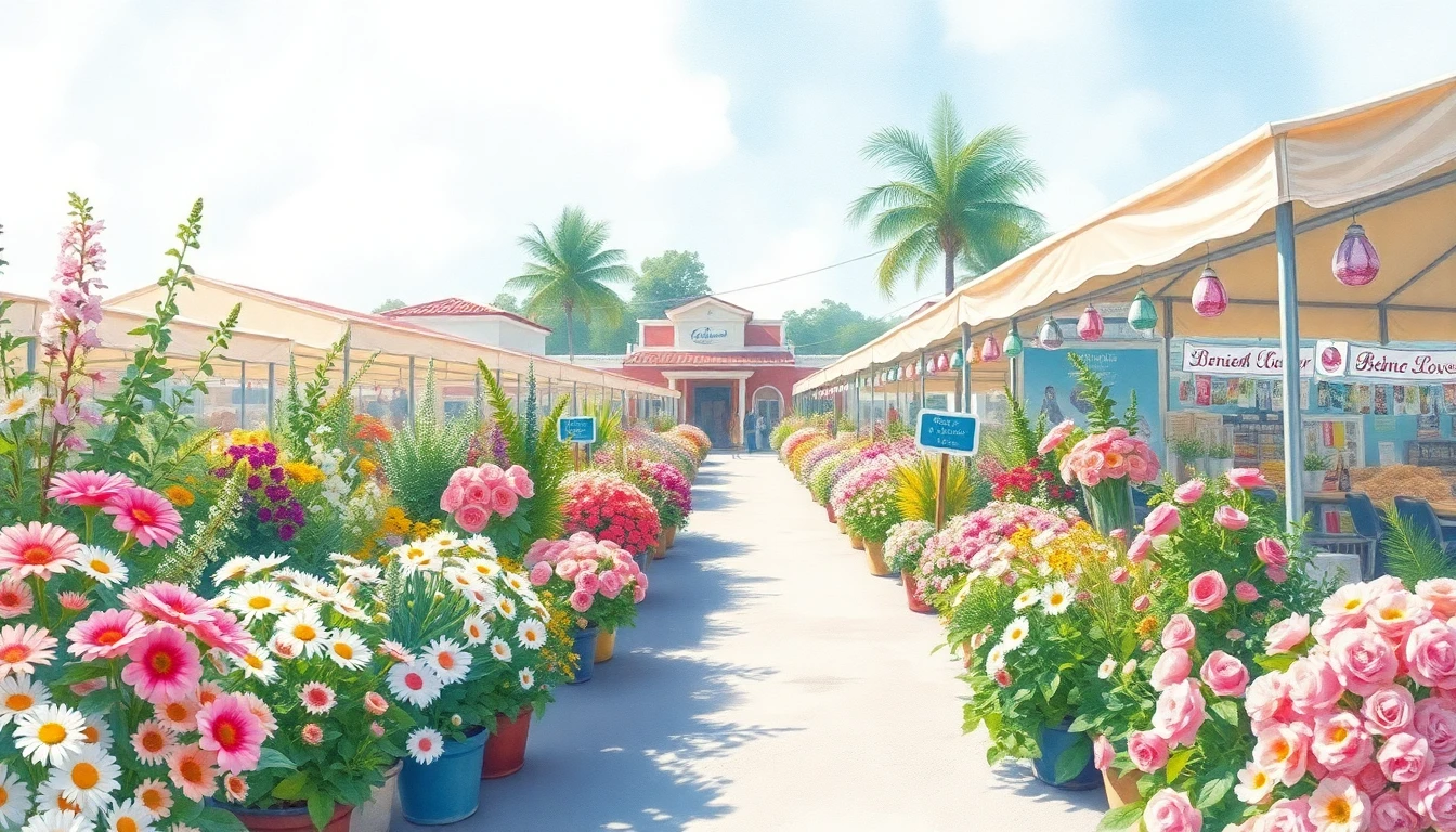 Watercolor illustration of a flower market in Belize City, BZ featuring wildflowers, daisies, roses