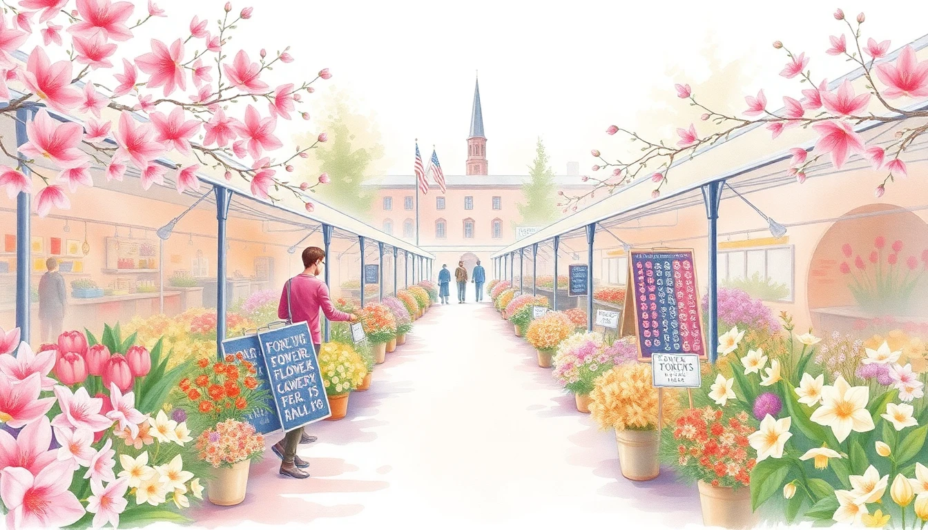Watercolor illustration of a flower market in Toronto, Canada featuring sugar maple blossoms, trillium, fireweed