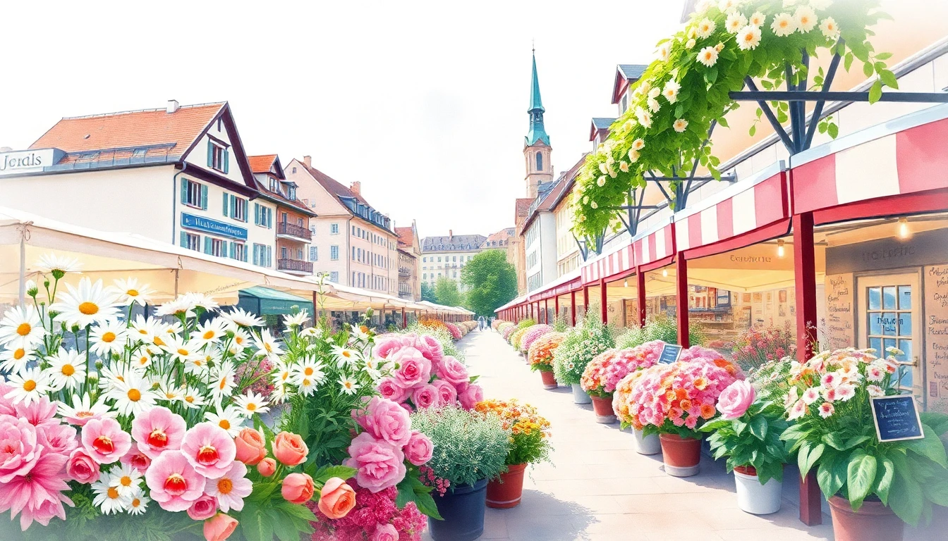 Watercolor illustration of a flower market in Bern, Switzerland featuring edelweiss, gentian, alpine roses