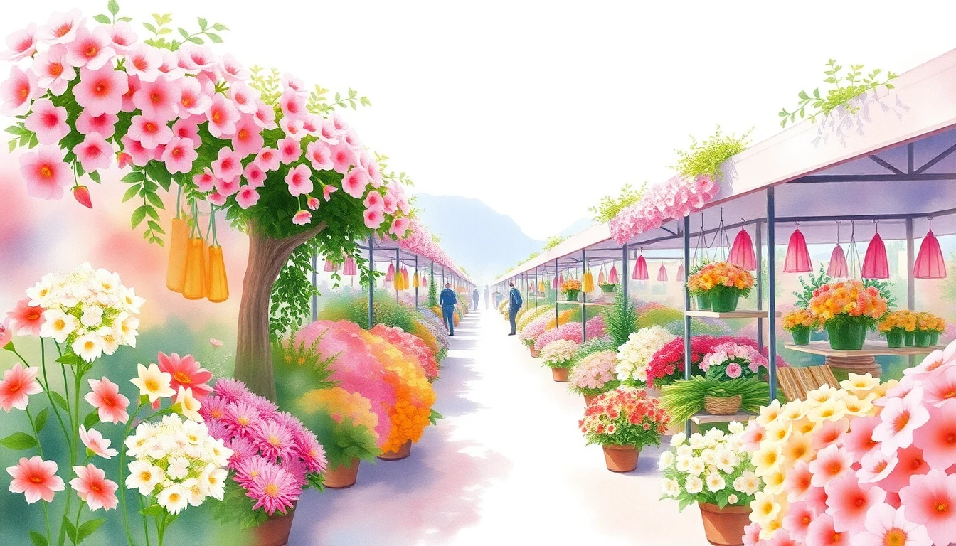 Watercolor illustration of a flower market in Las Condes, Chile featuring copihue, lapageria, Chilean bellflower