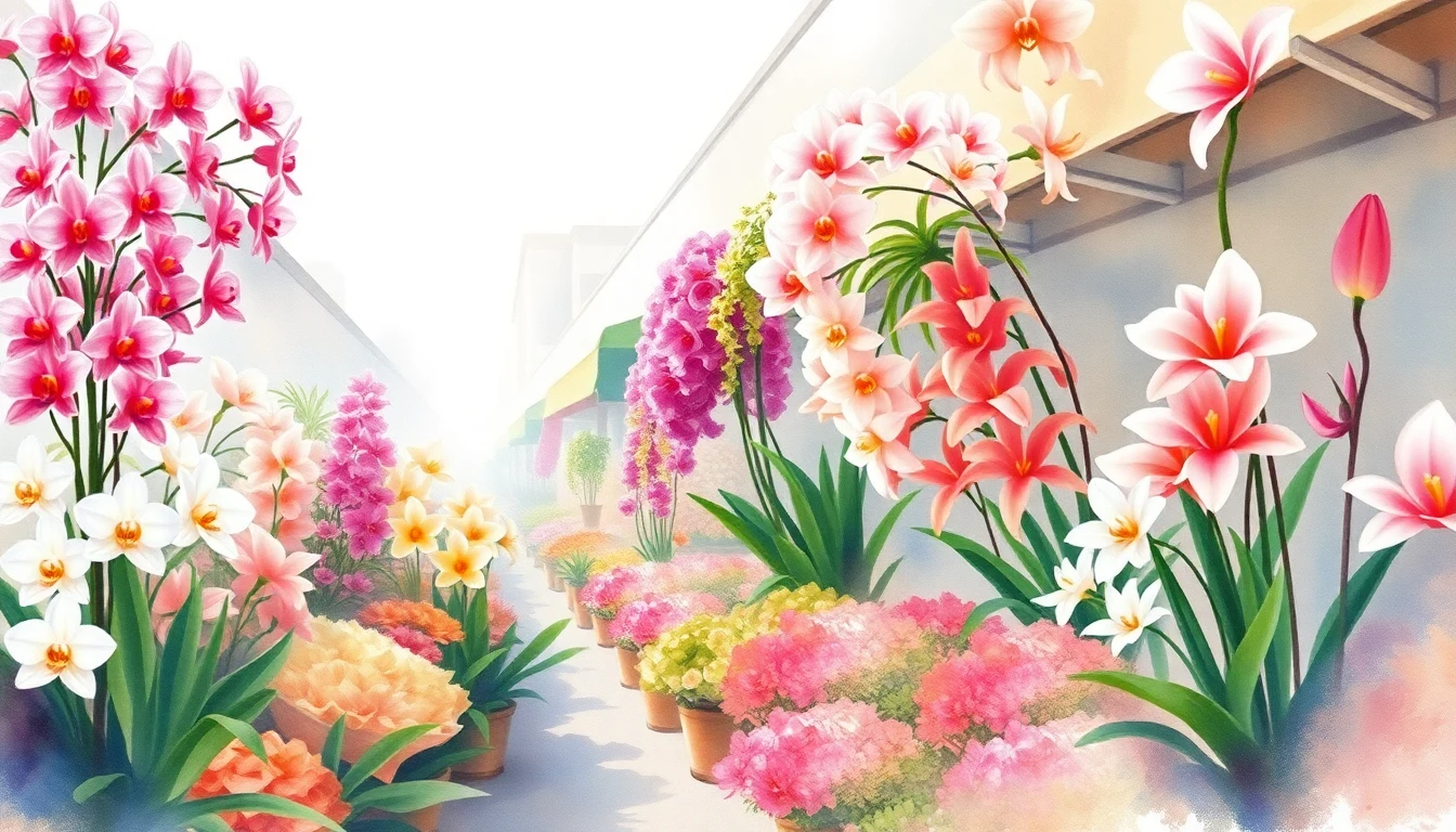 Watercolor illustration of a flower market in Bogotá D.C., Colombia featuring orchids, heliconia, cattleya