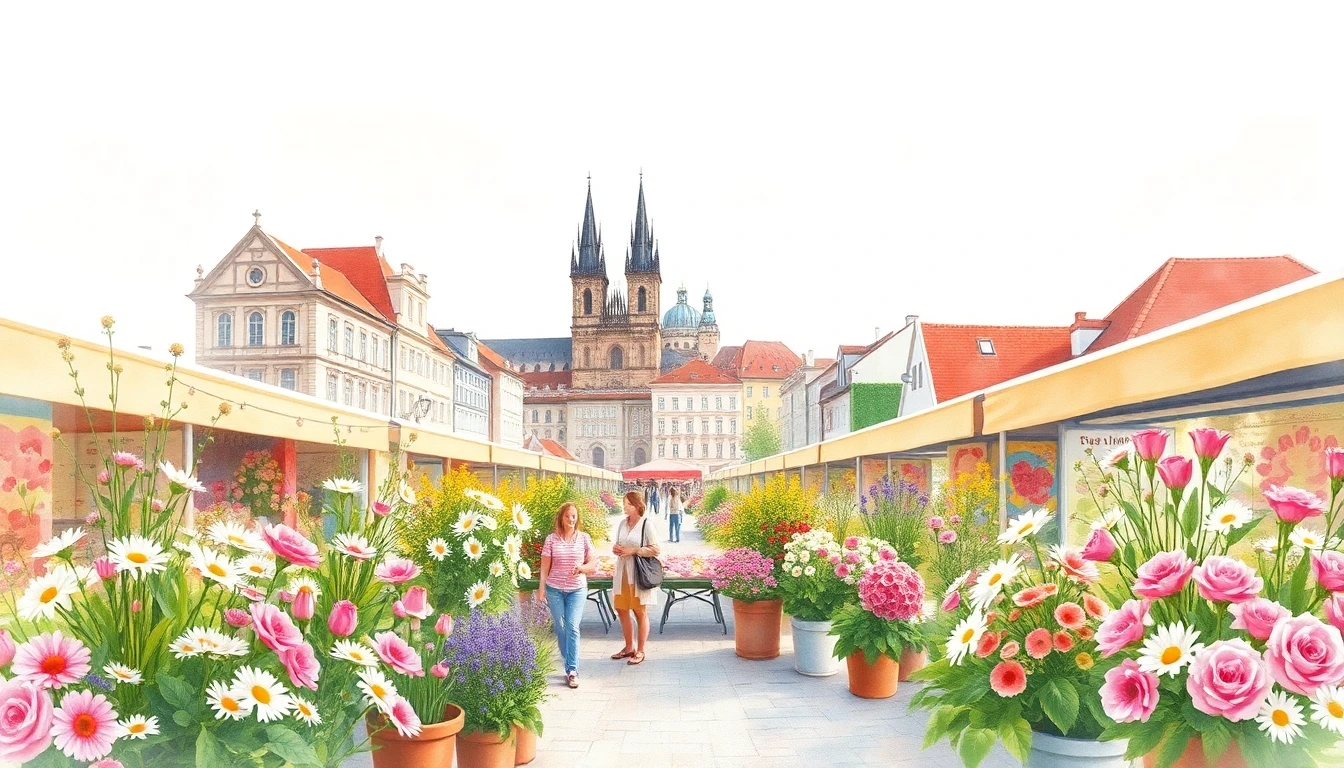 Watercolor illustration of a flower market in Capital City of Prague, CZ featuring wildflowers, daisies, roses