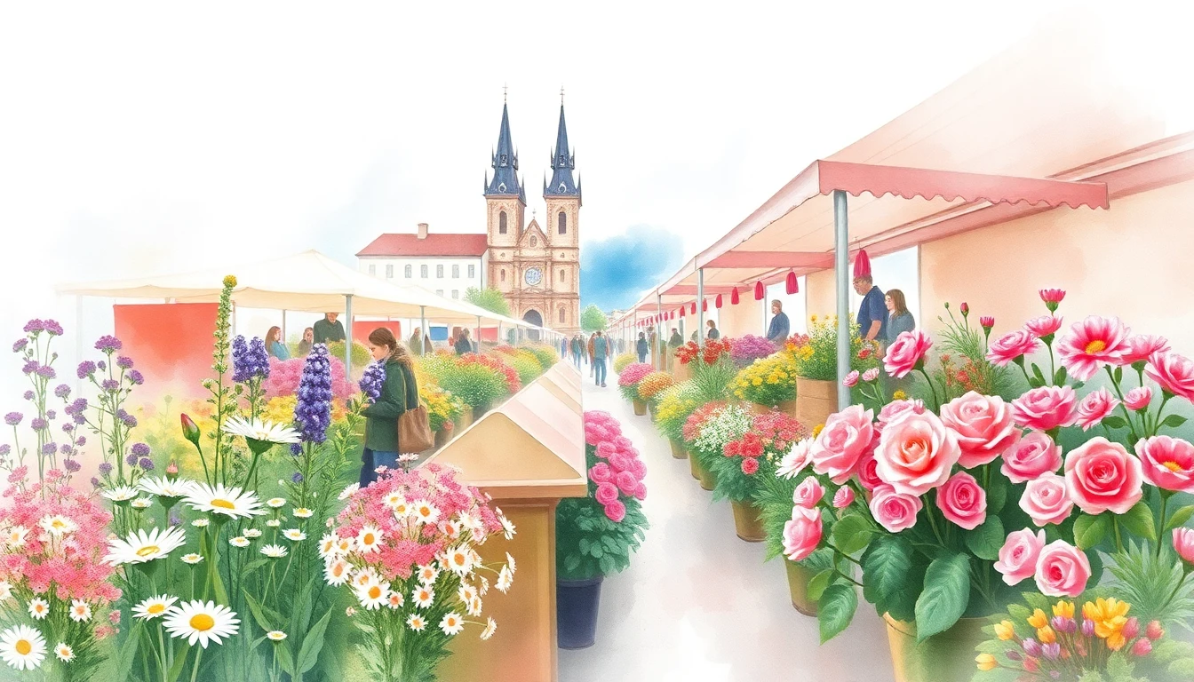 Watercolor illustration of a flower market in Brno, CZ featuring wildflowers, daisies, roses