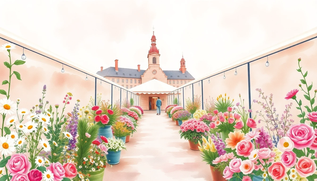 Watercolor illustration of a flower market in Olomouc, CZ featuring wildflowers, daisies, roses