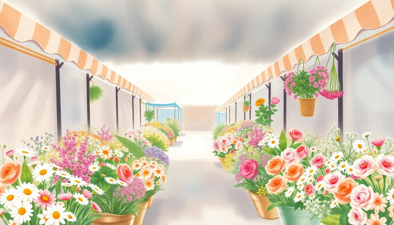 Watercolor illustration of a flower market in Kais, DZ featuring wildflowers, daisies, roses