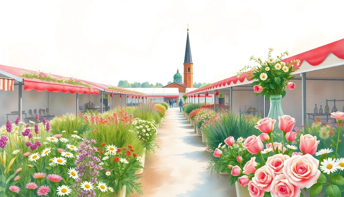 Watercolor illustration of a flower market in Narva, EE featuring wildflowers, daisies, roses