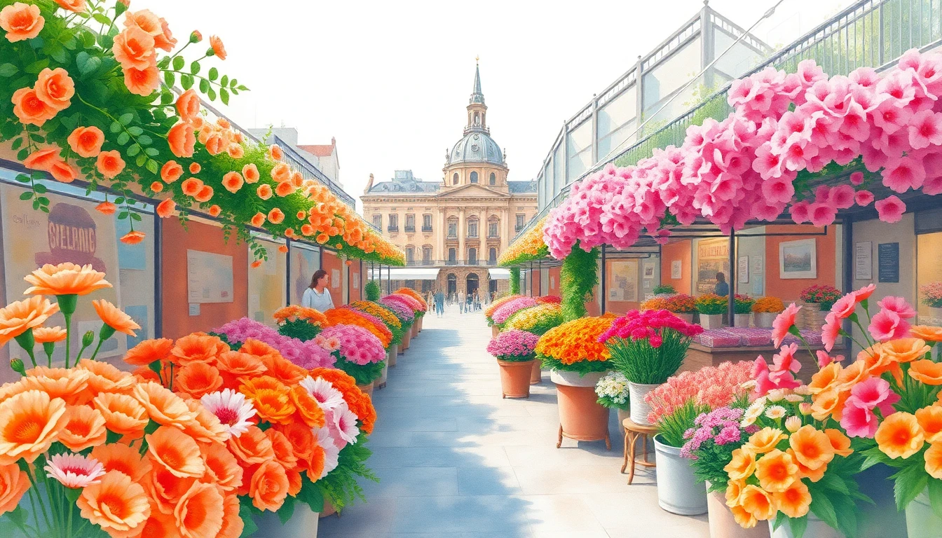 Watercolor illustration of a flower market in Madrid, Spain featuring carnations, orange blossoms, bougainvillea