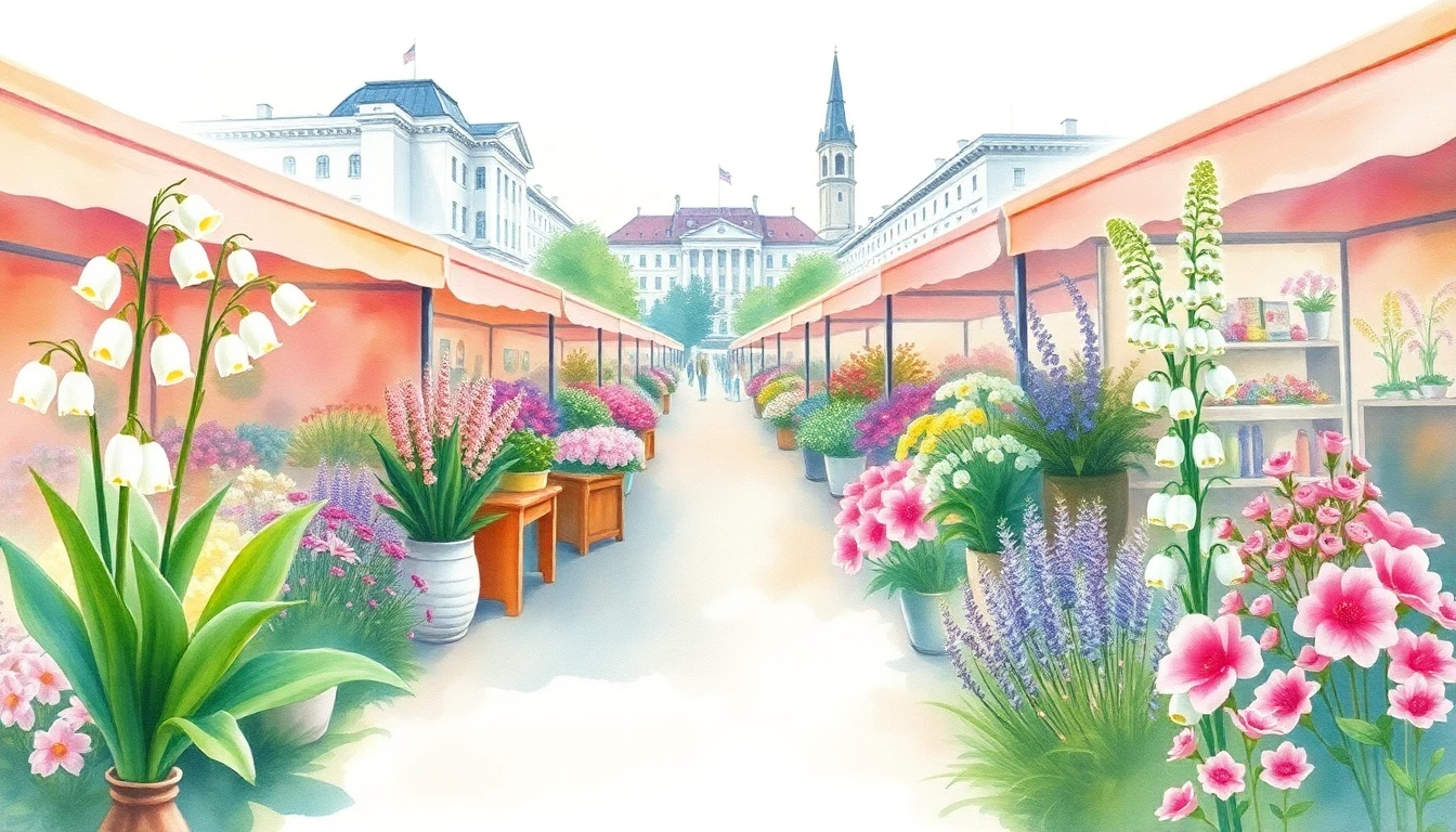 Watercolor illustration of a flower market in Helsinki, Finland featuring lily of the valley, cornflowers, fireweed