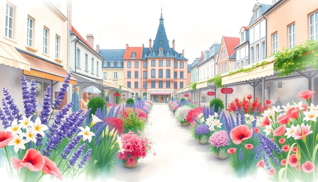 Watercolor illustration of a flower market in Lille, France featuring lavender, lilies, poppies