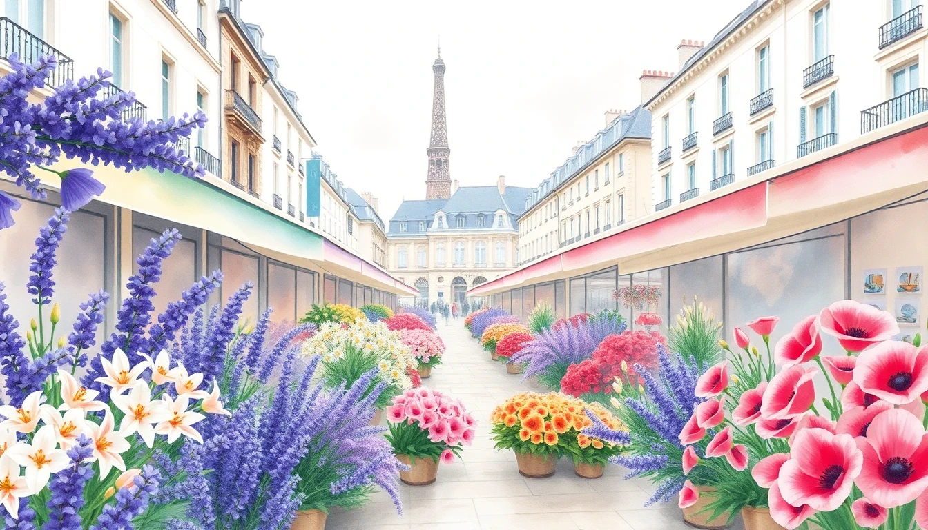 Watercolor illustration of a flower market in Paris, France featuring lavender, lilies, poppies