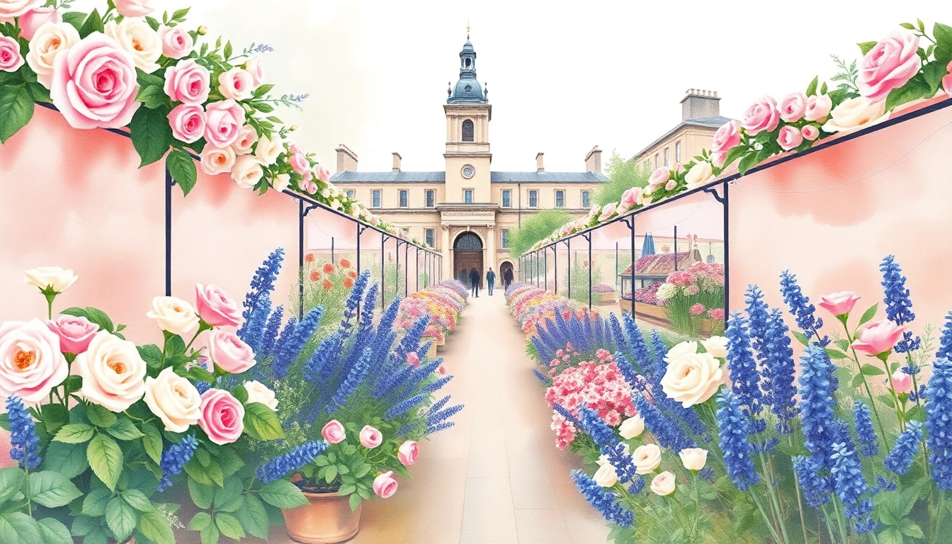 Watercolor illustration of a flower market in London, United Kingdom featuring English roses, lavender, bluebells