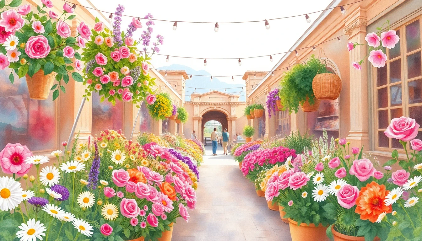 Watercolor illustration of a flower market in Antigua Guatemala, GT featuring wildflowers, daisies, roses