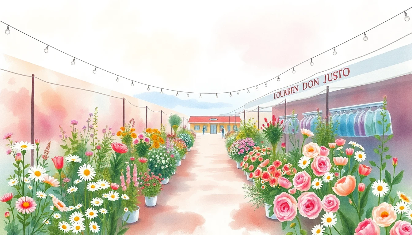 Watercolor illustration of a flower market in Don Justo, GT featuring wildflowers, daisies, roses