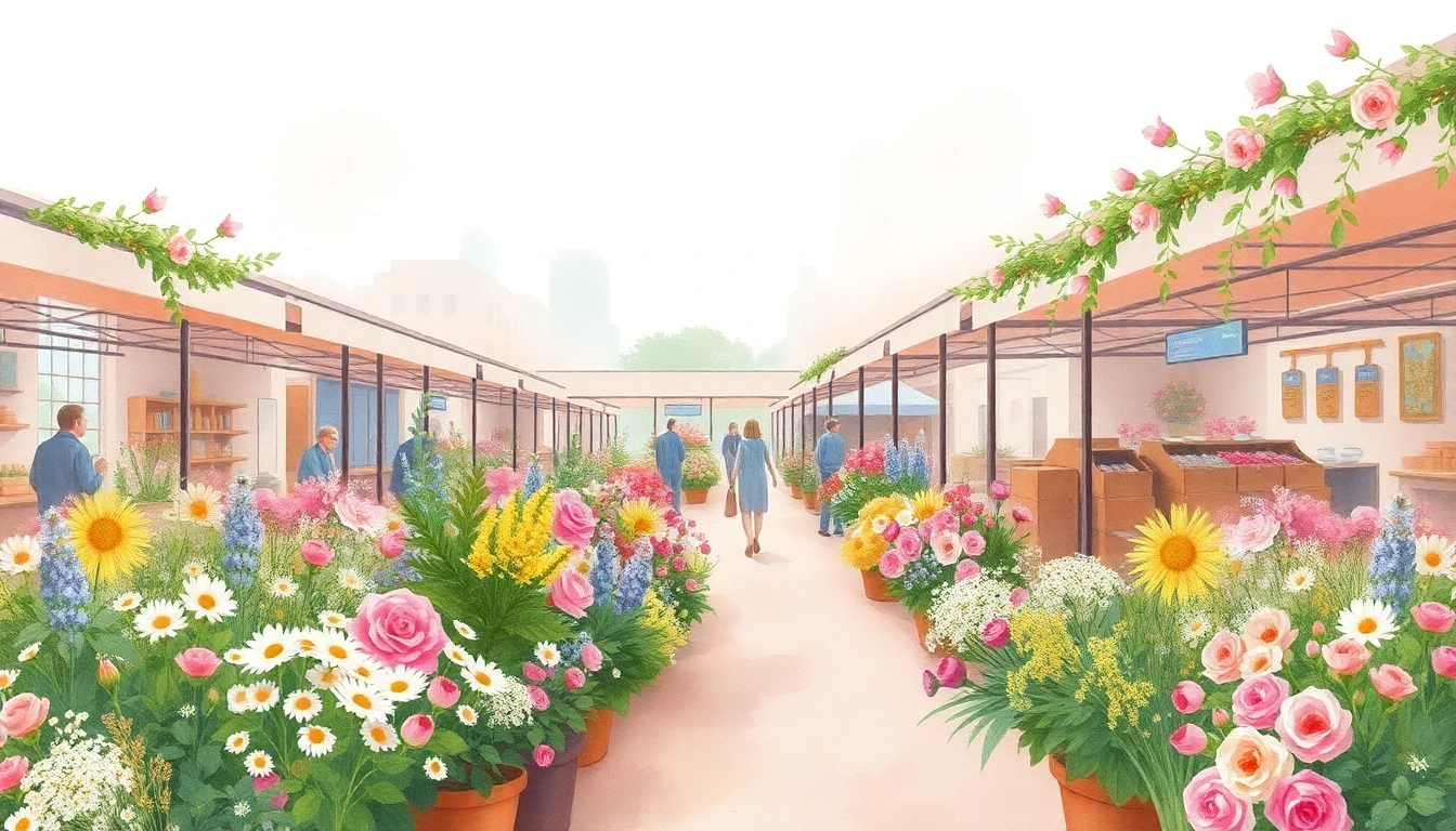 Watercolor illustration of a flower market in HN, HN featuring wildflowers, daisies, roses