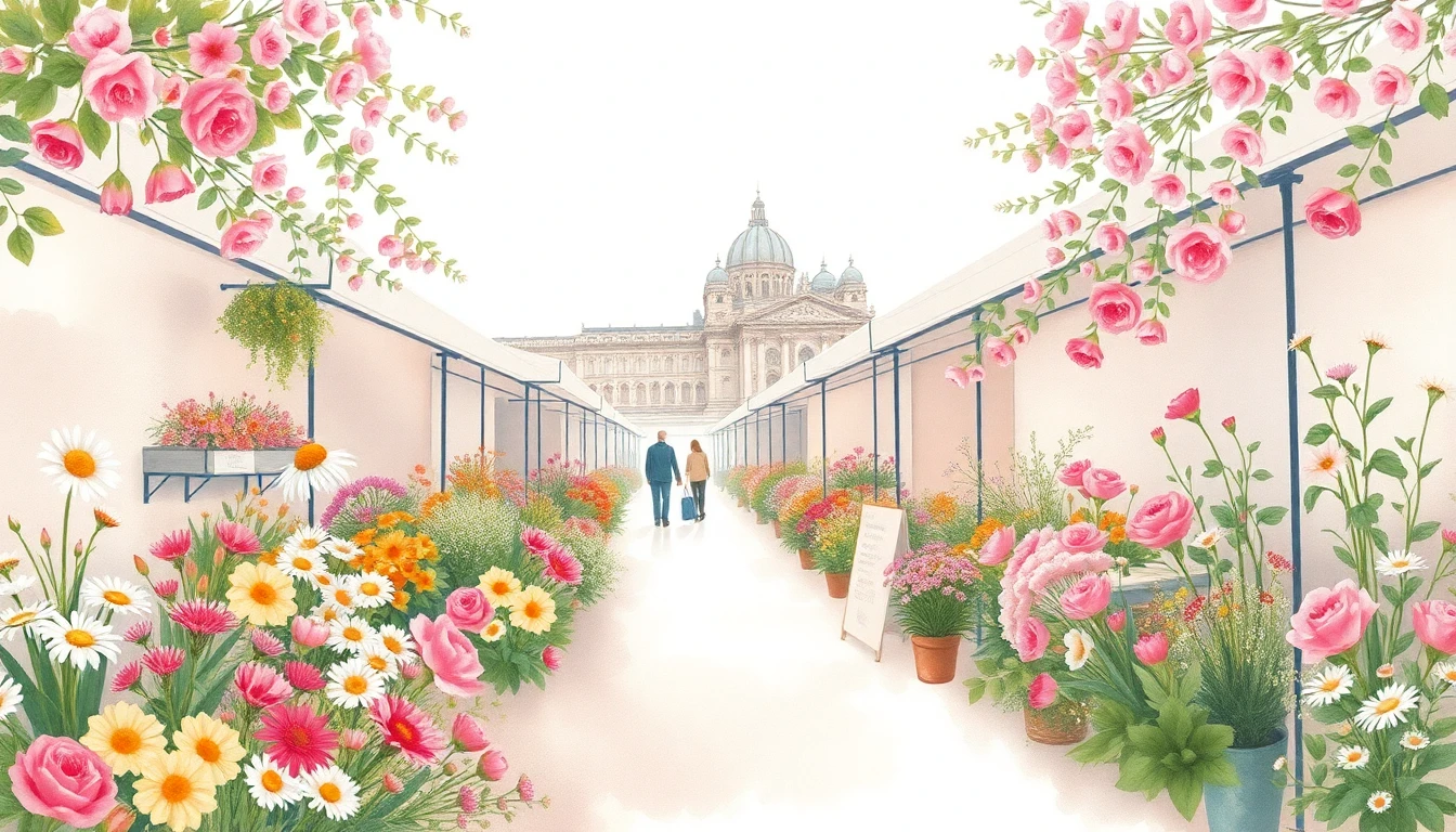 Watercolor illustration of a flower market in Budapest, HU featuring wildflowers, daisies, roses