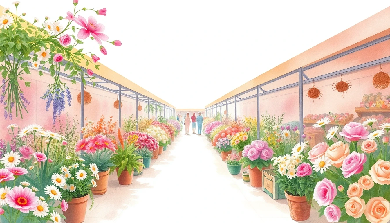 Watercolor illustration of a flower market in אשקלון, IL featuring wildflowers, daisies, roses