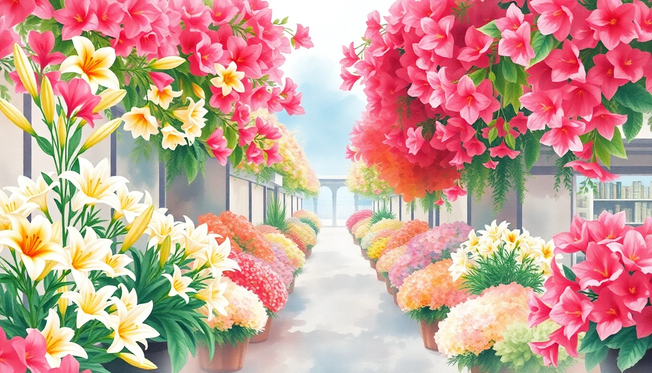 Watercolor illustration of a flower market in Genoa, Italy featuring lilies, oleander, bougainvillea