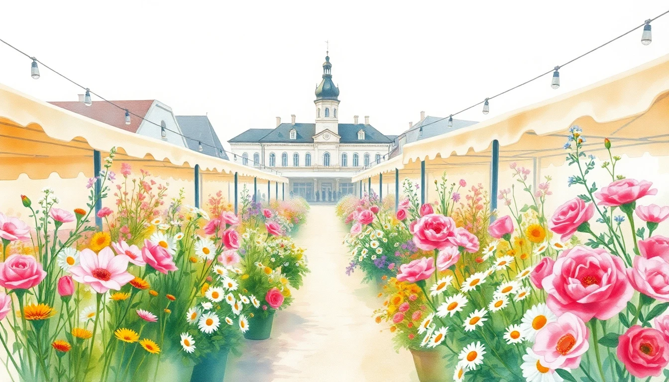 Watercolor illustration of a flower market in Vilnius, LT featuring wildflowers, daisies, roses