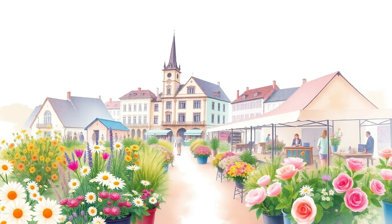 Watercolor illustration of a flower market in Strassen, LU featuring wildflowers, daisies, roses