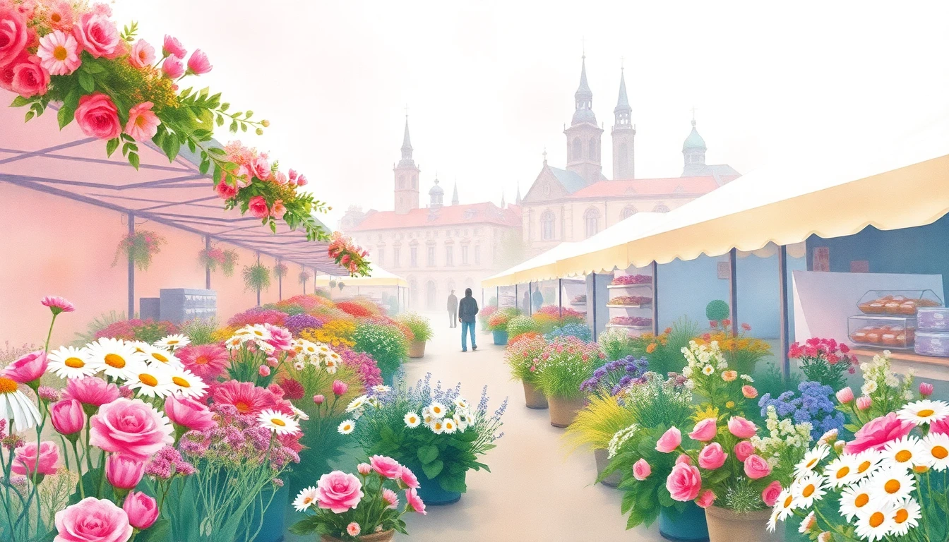 Watercolor illustration of a flower market in Rīga, LV featuring wildflowers, daisies, roses
