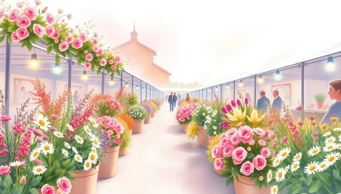 Watercolor illustration of a flower market in Daugavpils, LV featuring wildflowers, daisies, roses