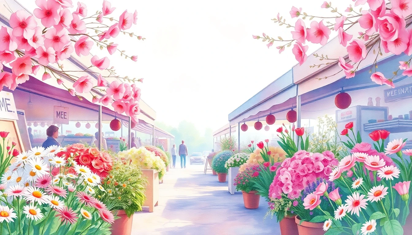 Watercolor illustration of a flower market in ME, ME featuring wildflowers, daisies, roses