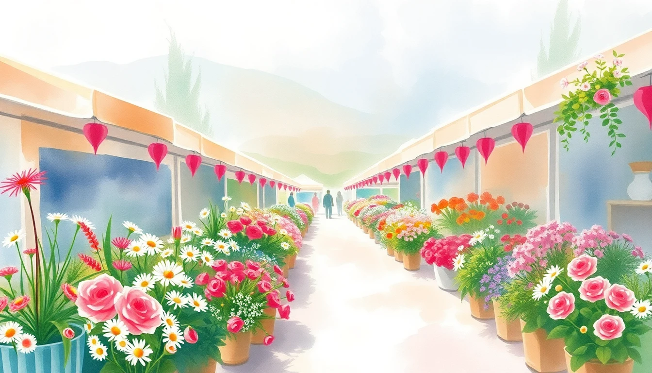 Watercolor illustration of a flower market in Ohrid, MK featuring wildflowers, daisies, roses
