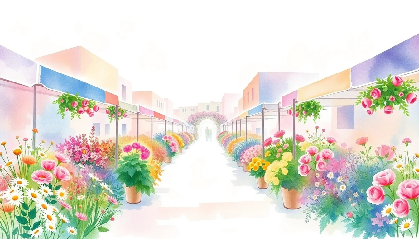 Watercolor illustration of a flower market in Birkirkara, MT featuring wildflowers, daisies, roses