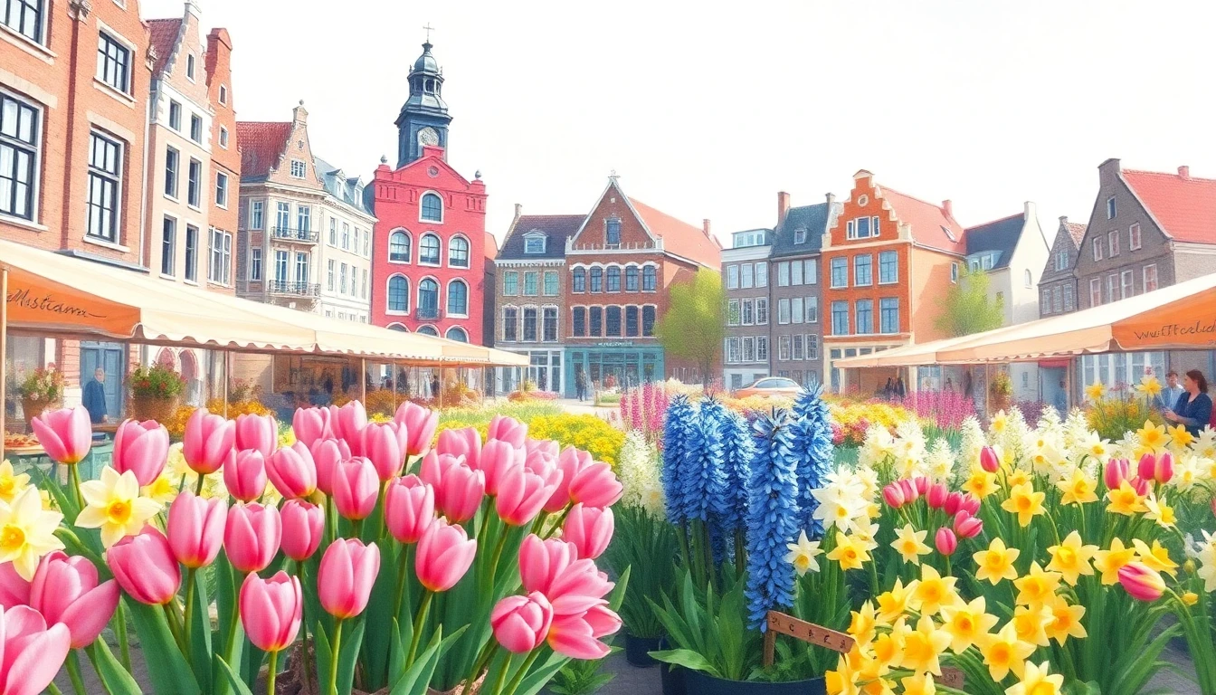 Watercolor illustration of a flower market in Amsterdam, Netherlands featuring tulips, daffodils, hyacinths