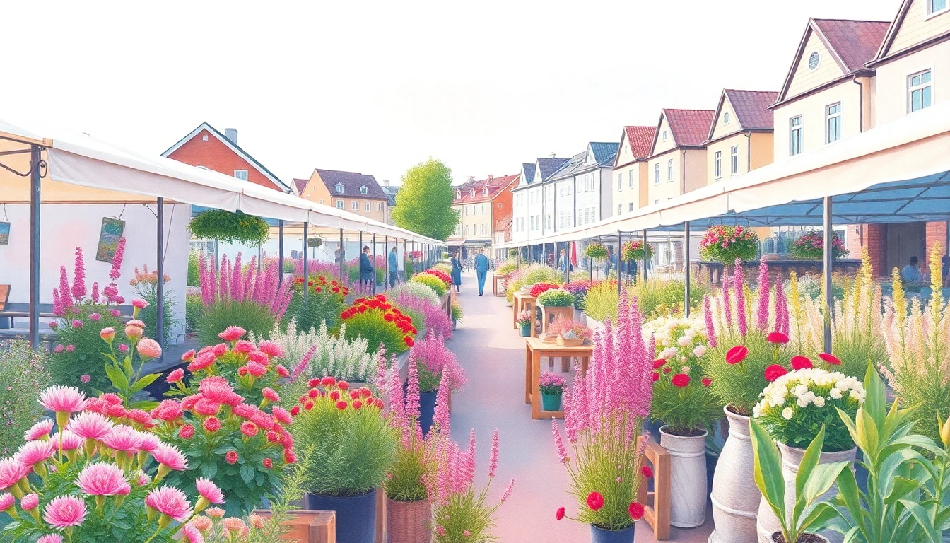 Watercolor illustration of a flower market in Trondheim, Norway featuring heather, mountain avens, fireweed