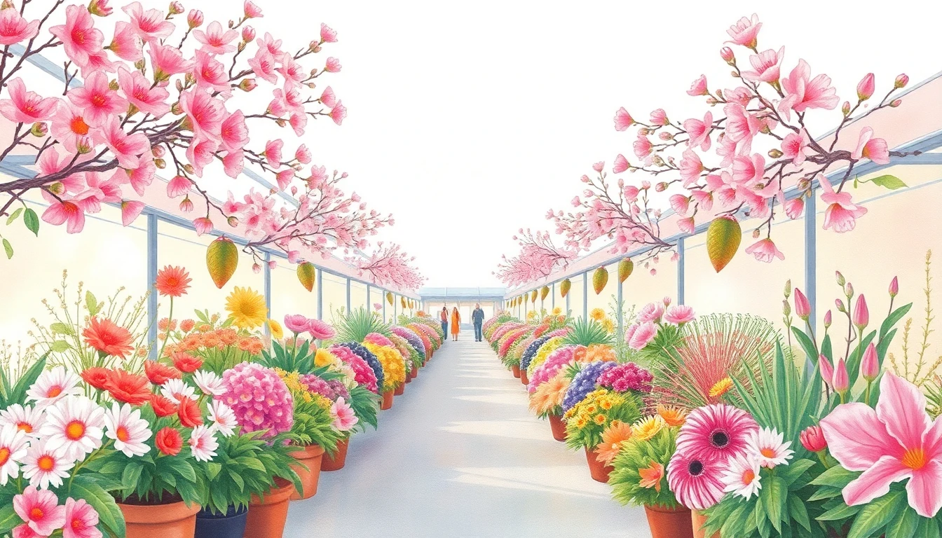 Watercolor illustration of a flower market in Christchurch, New Zealand featuring pohutukawa, kowhai, manuka
