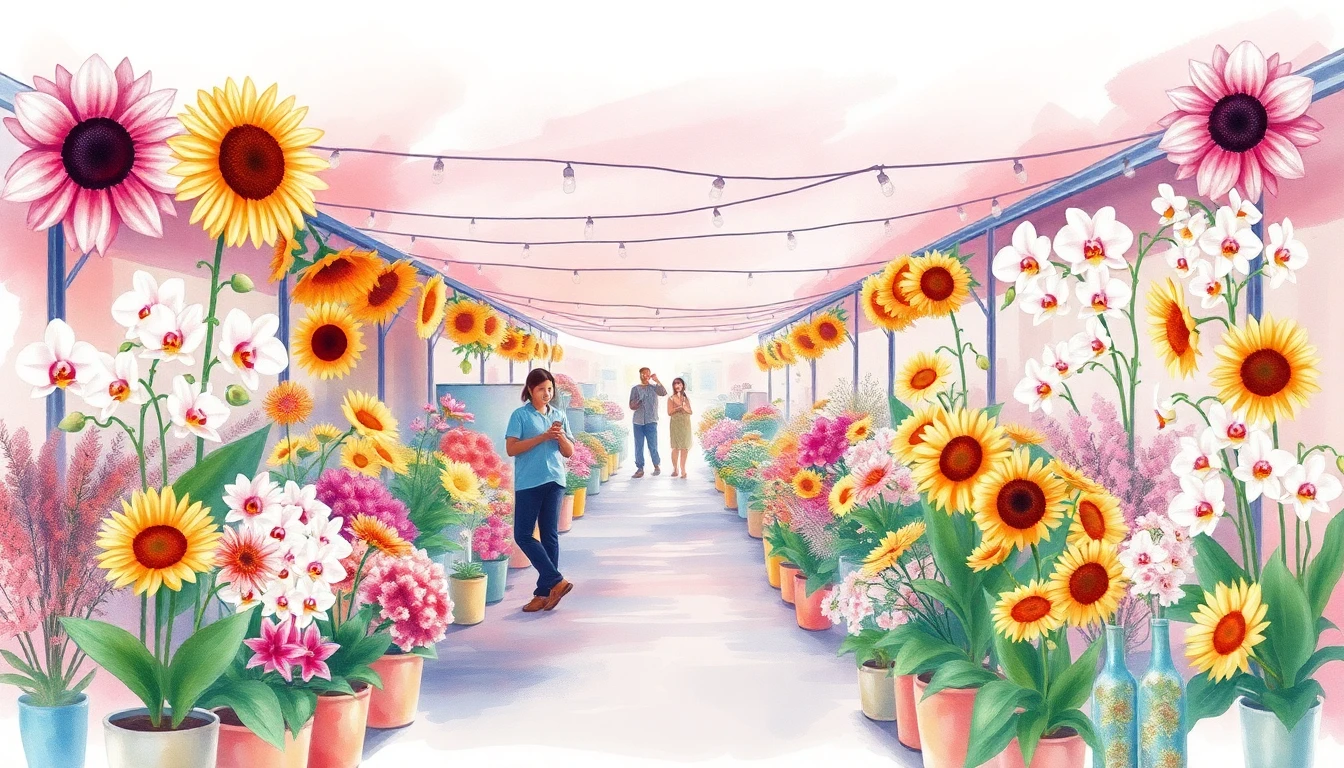 Watercolor illustration of a flower market in José Luis Bustamante y Rivero, Peru featuring cantuta, orchids, sunflowers