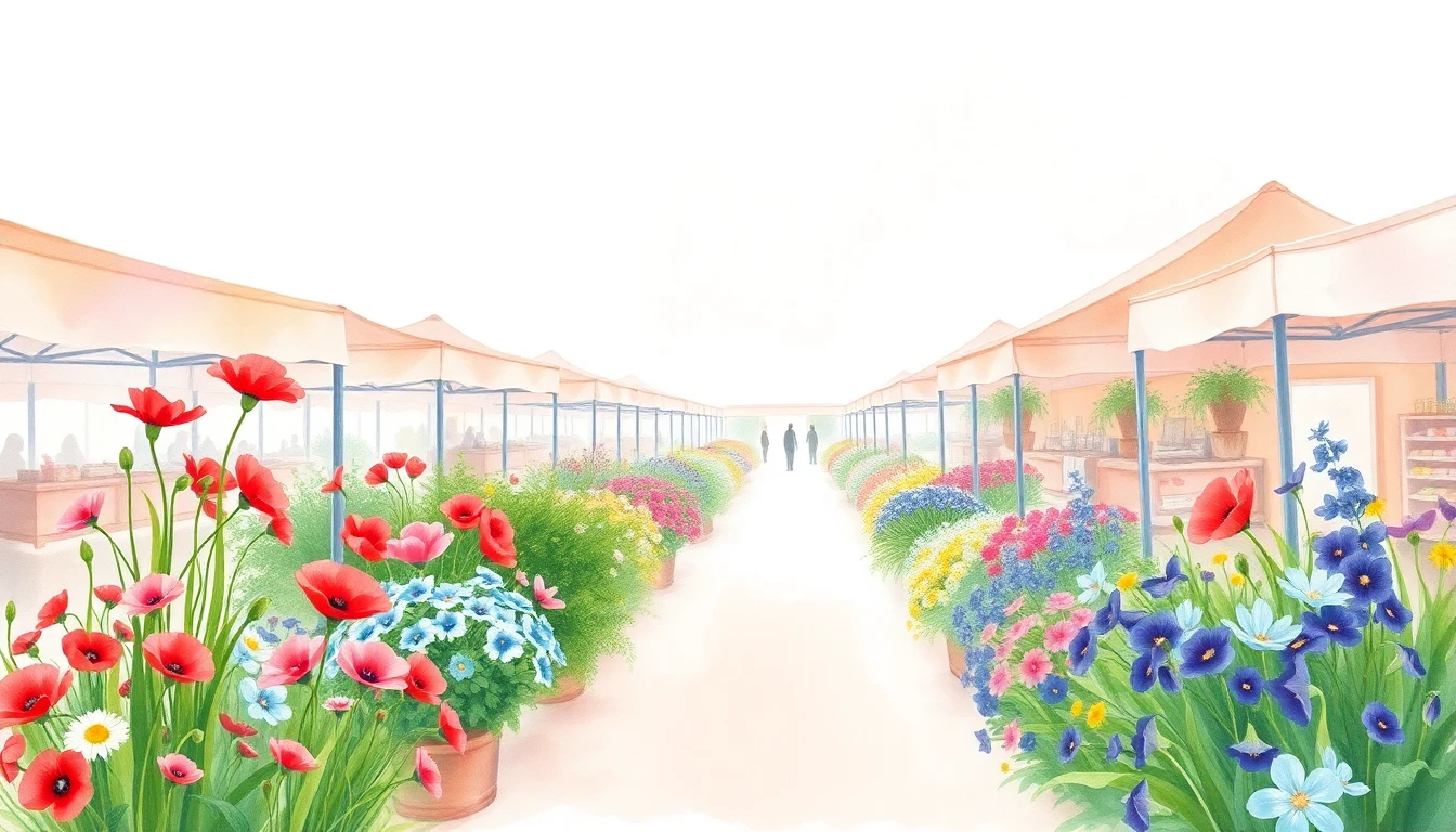 Watercolor illustration of a flower market in Gliwice, Poland featuring poppies, cornflowers, pansies
