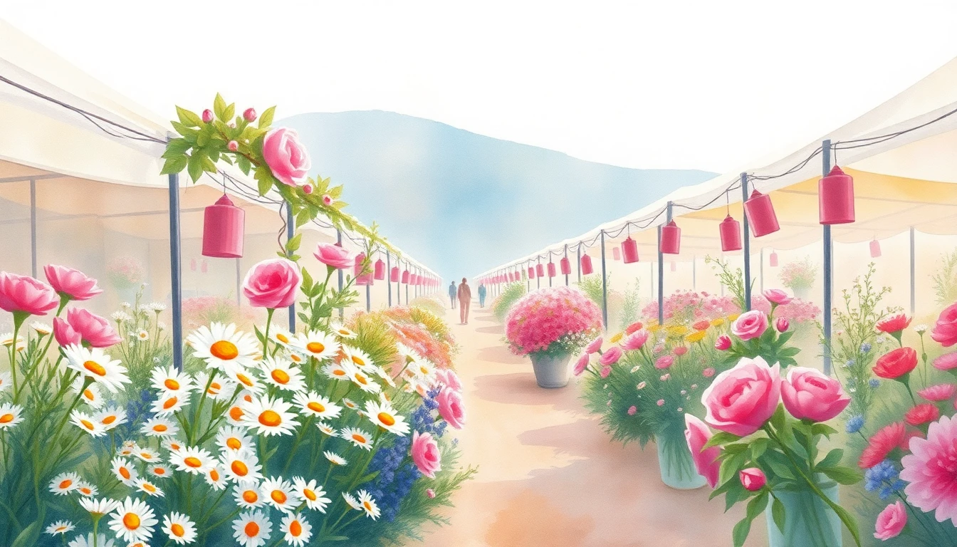 Watercolor illustration of a flower market in Tulkarm, PS featuring wildflowers, daisies, roses