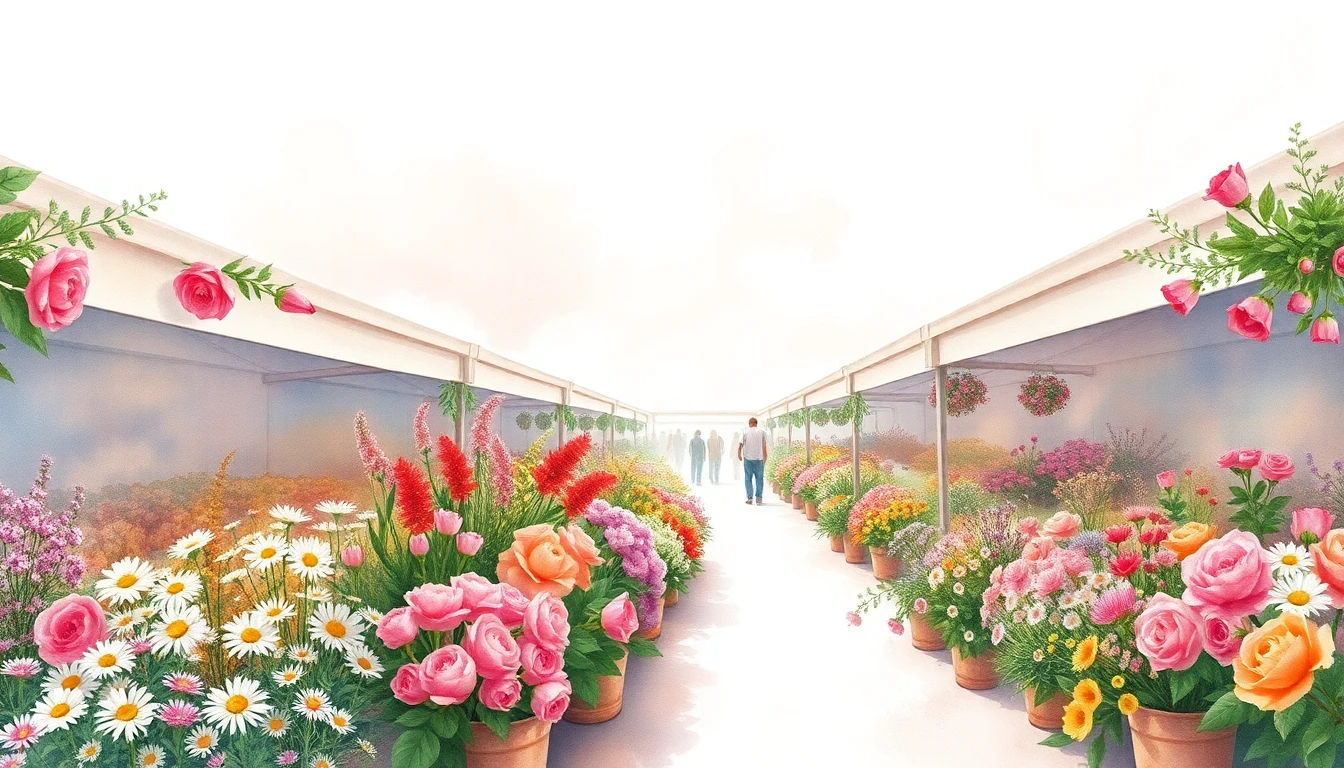 Watercolor illustration of a flower market in Asuncion, PY featuring wildflowers, daisies, roses