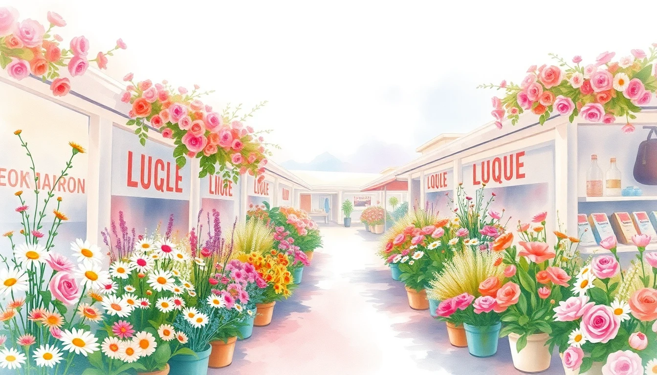 Watercolor illustration of a flower market in Luque, PY featuring wildflowers, daisies, roses
