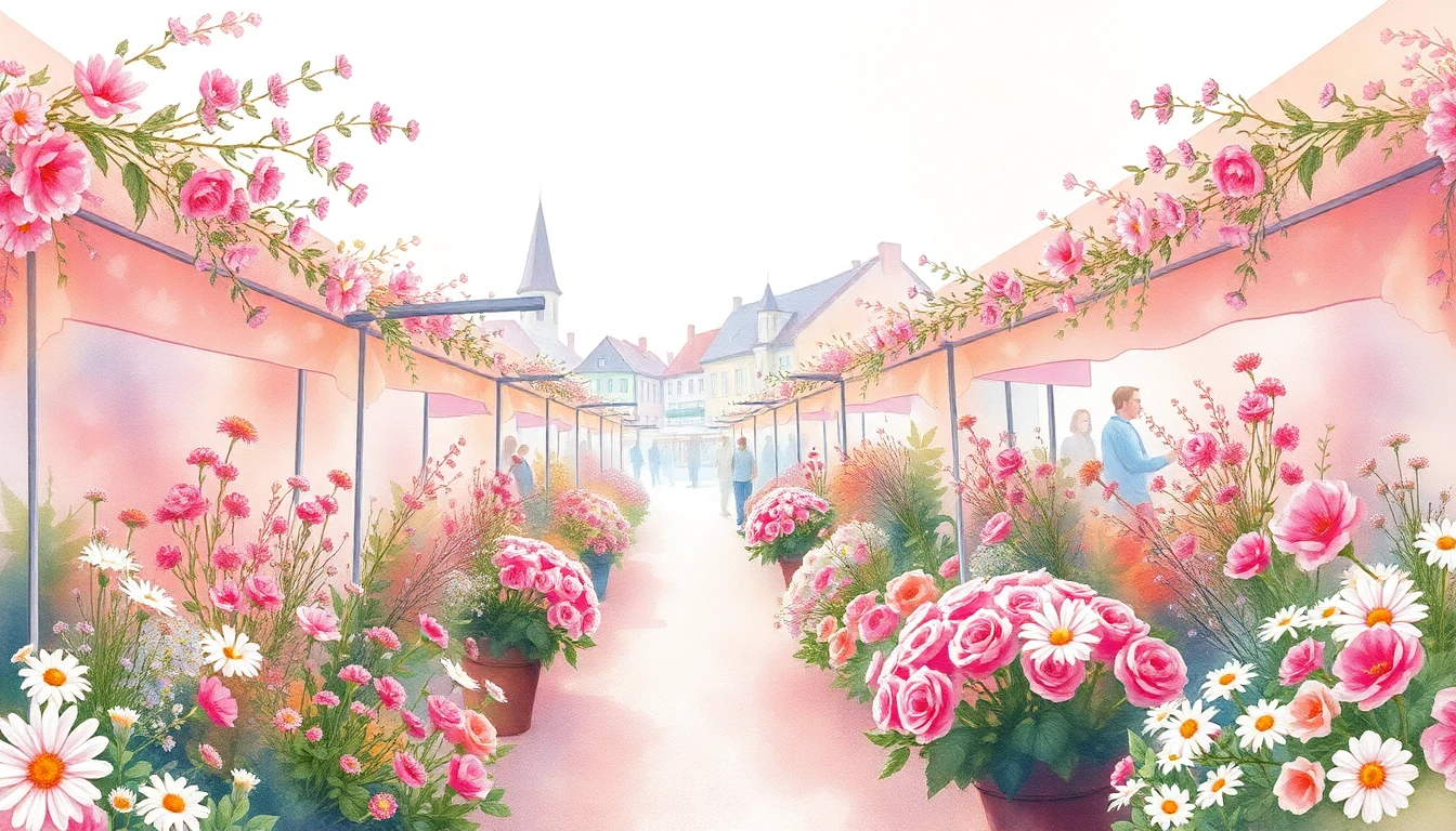 Watercolor illustration of a flower market in Timișoara, RO featuring wildflowers, daisies, roses